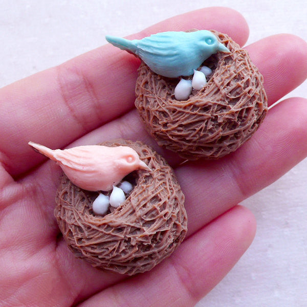 Bird Nest Resin Cabochons (2pcs / 26mm x 36mm / Pink & Blue / Flatback) Animal Scrapbook Lovely Embellishment Brooch Jewellery Making CAB530