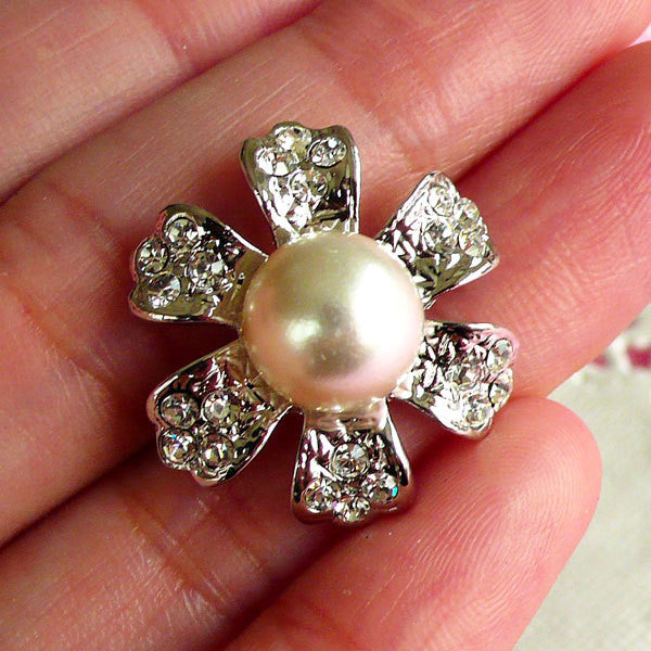 Bling Bling Flower Metal Cabochon / Silver Floral Cabochon with Pearl (24mm) Wedding Decoration Sparkle Hair Bow Center DIY Earrings CAB089