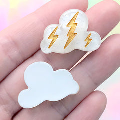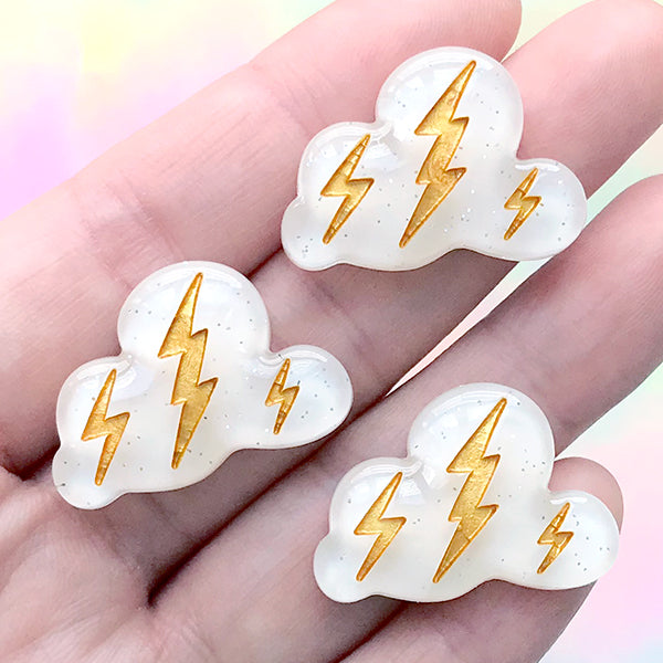 Cloud with Lightning Cabochon | Thunderstorm Weather Embellishment | Kawaii Decoden Craft Supplies (3 pcs / White & Gold / 27mm x 19mm)