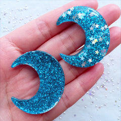 CLEARANCE Crescent Moon Cabochons with Star Confetti | Glittery Moon Cabochon with Shimmer Glitter | Kawaii Cabochons | Bling Bling Embellishment | Decoden Phone Case (2 pcs / Blue / 33mm x 39mm / Flat Back)