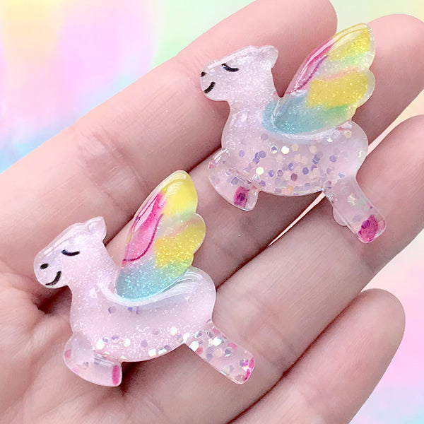 Glittery flying horse resin cabochon. Excellent for phone case decoden, mixed media art, scrapbooking, card making, party supplies, kawaii jewelry and accessories making, etc. Quantity: 2 pcs...