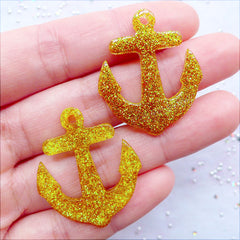 Glitter Anchor Charms | Nautical Anchor Pendant | Resin Anchor Cabochons | Kawaii Decoden Supplies | Glittery Cell Phone Deco | Kistch Jewellery Making (2 pcs / Gold / 27mm x 32mm / Flat Back)