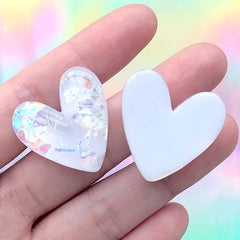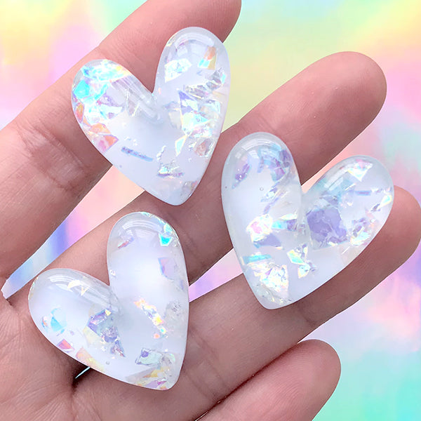 Glittery Heart Cabochon with Iridescent Flakes | Kawaii Decoden Piece with Glitter | Phone Case Decoration (3 pcs / White / 27mm x 27mm)