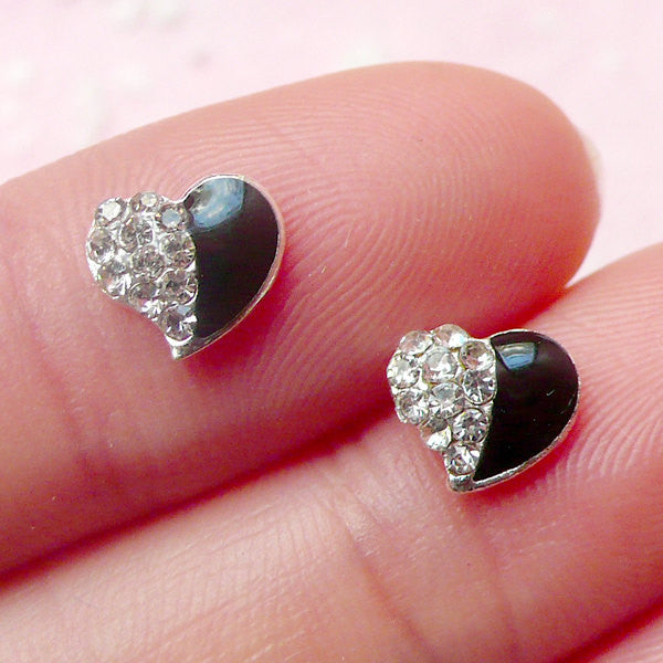Heart Cabochon (2pcs) (Black w/ Clear Rhinestones) Fake Miniature Cupcake Topper Earring Making Nail Art Nail Decoration Scrapbooking NAC112