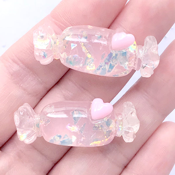Kawaii candy cabochon with iridescent glitter flakes. Excellent for phone case decoden project, mixed media art, scrapbooking, party supplies, kawaii jewelry and accessories making, etc. Quantity: 2...