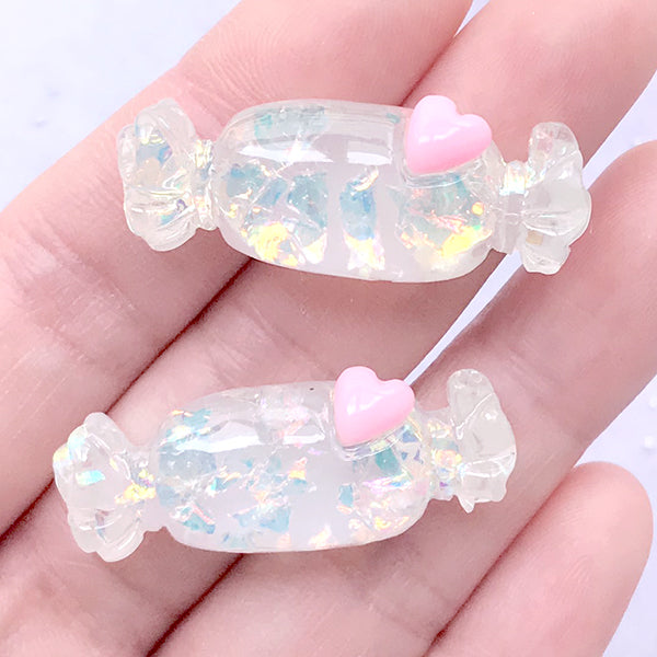 Kawaii candy cabochon with iridescent glitter flakes. Excellent for phone case decoden project, mixed media art, scrapbooking, party supplies, kawaii jewelry and accessories making, etc. Quantity: 2...