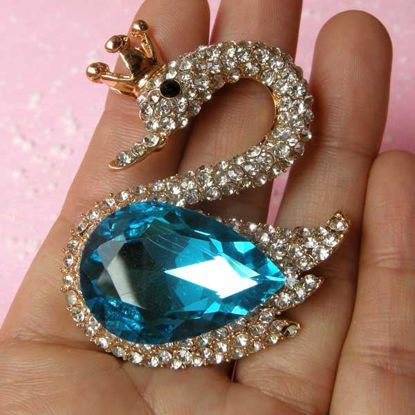 Large Swan Metal Cabochon with Rhinestones / Animal Cabochon (Blue / 43mm x 53mm) Bling Bling Embellishment Bird Jewellery Decoden CAB126