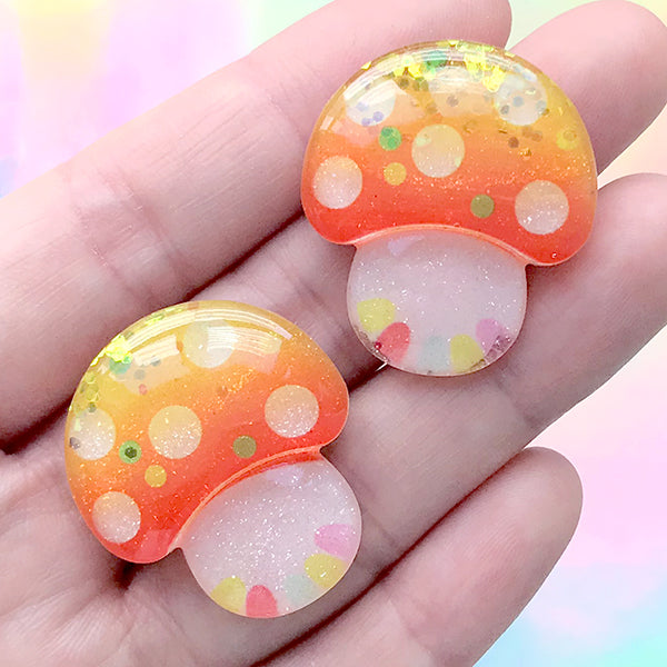 Glittery mushroom resin cabochon. Excellent for phone case decoden, mixed media art, scrapbooking, card making, party supplies, kawaii jewelry and accessories making, etc. Quantity: 2 pcs...