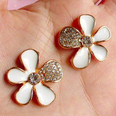 Metal Flower Cabochons w/ Rhinestones (2pcs / 26mm / Gold & White Enamel) Phone Case Deco Floral Hair Bow Center Applique Bling Decor CAB013