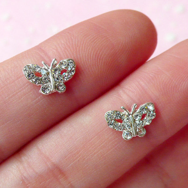 Mini Butterfly Cabochon (2pcs) (Silver w/ Clear Rhinestones) Fake Miniature Cupcake Topper Earring Making Nail Art Decoration NAC070