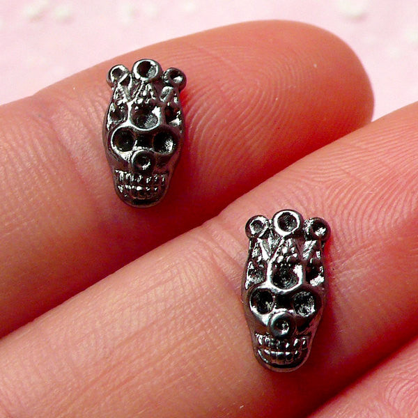 Mini Skull Head w/ Crown Cabochons (2pcs) (10mm / Black Silver) Fake Miniature Cupcake Topper Earring Making Punk Nail Art Decoration NAC126
