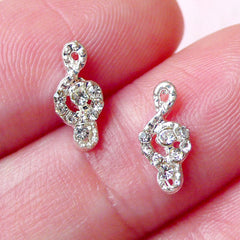 Tiny G-clef Music Note Cabochon (2pcs) (Silver w/ Clear Rhinestones) Fake Miniature Cupcake Topper Earring Making Nail Art Decoration NAC163