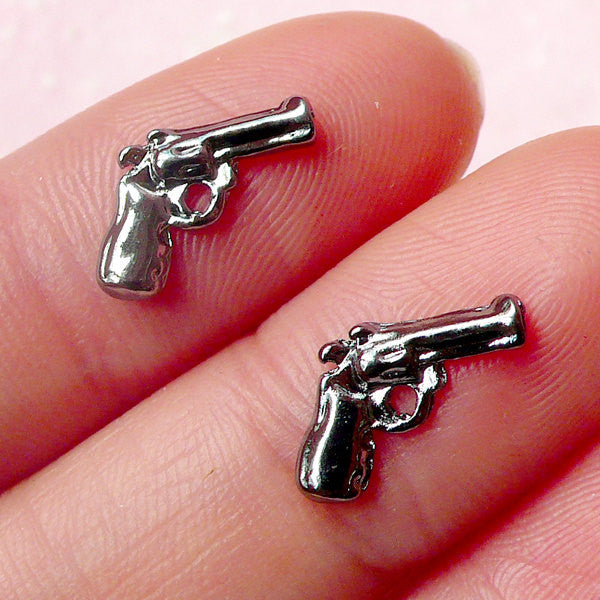 Tiny Gun Pistol Revolver Cabochon (2pcs) (12mm / Black Silver) Fake Miniature Cupcake Topper Earring Making Rock Nail Art Decoration NAC127