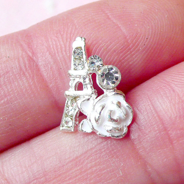 Tiny Paris Tower and Flower Cabochon (1pc) (Silver w/ Clear Rhinestones) Fake Mini Cupcake Topper Earrings Making Nail Art Decoration NAC160