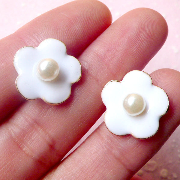 CLEARANCE White Flower Cabochon (White & Gold w/ White Pearl / 15mm / 2pcs) Jewelry Earrings Hair Clip Making Scrapbooking Phone Case Decoden CAB336