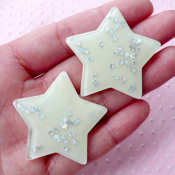 CLEARANCE Cute Star Cabochons w/ Star Sprinkles Confetti Sequin Glitter (2pcs / 41mm x 38mm / White / Flat Back) Kawaii Cell Phone Decoration CAB430