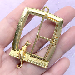 Cat Sitting on Window Open Bezel Charm with Movable Window Frame | Kawaii Kitty Deco Frame for UV Resin Filling (1 piece / Gold / 36mm x 55mm)