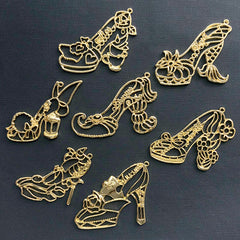 High Heel Open Bezel Assortment | Alice in Wonderland Mermaid Fancy Shoe Pendant | Fairytale Deco Frame for UV Resin Filling (7 pcs / Gold)