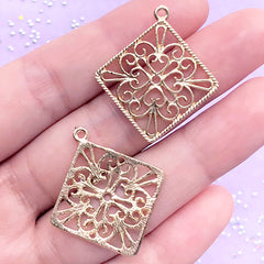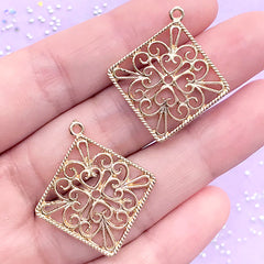 Square Openwork Pendant | Square Open Bezel Charm | Filigree Deco Frame for UV Resin Filling (2 pcs / Gold / 27mm x 30mm)