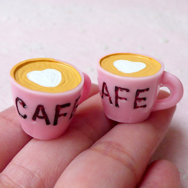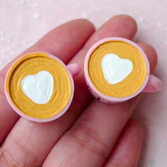 3D Cafe Coffee Cup Cabochons w/ Heart Latte Art (2pcs / 25mm x 17mm / Flat Bottom) Miniature Coffee Kitsch Jewelry Whimsical Decoden FCAB288
