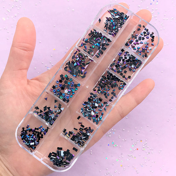 Assorted Nail Charms in AB Black Color | Resin Fillers | Mini Rhinestones in Irregular Shapes | Nail Art Supplies (12 Designs)