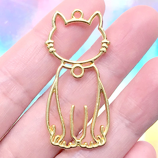 Cat Sitting Open Bezel Charm | Cute Pet Deco Frame for UV Resin Filling | Animal Pendant | Kawaii Resin Jewelry Making (1 piece / Gold / 21mm x 44mm)