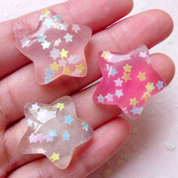 Decora Fairy Kei Jewelry Puffy Star Resin Cabochons w/ Glitter Confetti (3pcs / 25mm x 24mm) Kawaii Decoration Phone Case Decoden CAB375