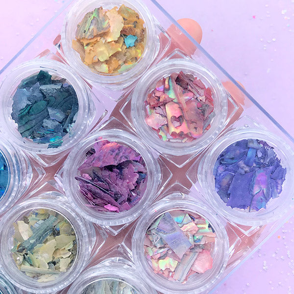 High quality iridescent abalone seashell flakes in various colors. Excellent for nail art, resin jewelry and accessories making and all kinds of decorations, etc. Quantity: 12 pots Net Weight...
