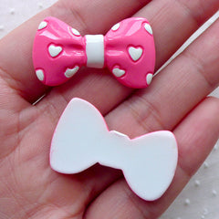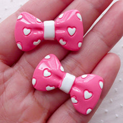 Pink Bow w/ Heart Cabochons (2pcs / 32mm x 18mm / Pink & White / Flatback) Cute Bowtie Phone Case Deco Embellishment Hair Clip Making CAB463