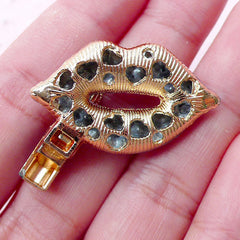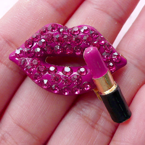 Sexy Lips and Lipstick Metal Cabochon w/ Bling Bling Rhinestones (1 piece / 36mm x 25mm / Dark Pink) Hot Makeup Kissing Embellishment CAB440