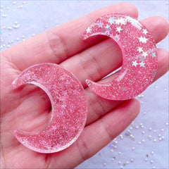 Shimmer Moon Cabochons with Star Confetti | Crescent Moon Cabochon with Glitter | Glittery Decoden Cabochon | Kawaii Embellishment | Phone Case Decoration (2 pcs / Pink / 33mm x 39mm / Flat Back)