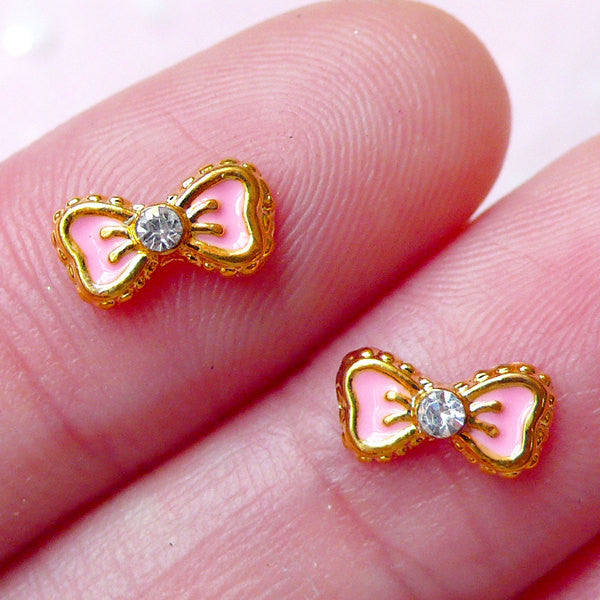 CLEARANCE Tiny Pink Bow Bowtie Cabochon with Clear Rhinestones (2pcs / 9mm) Fake Miniature Cupcake Topper Earrings Making Nail Art Decoration NAC191